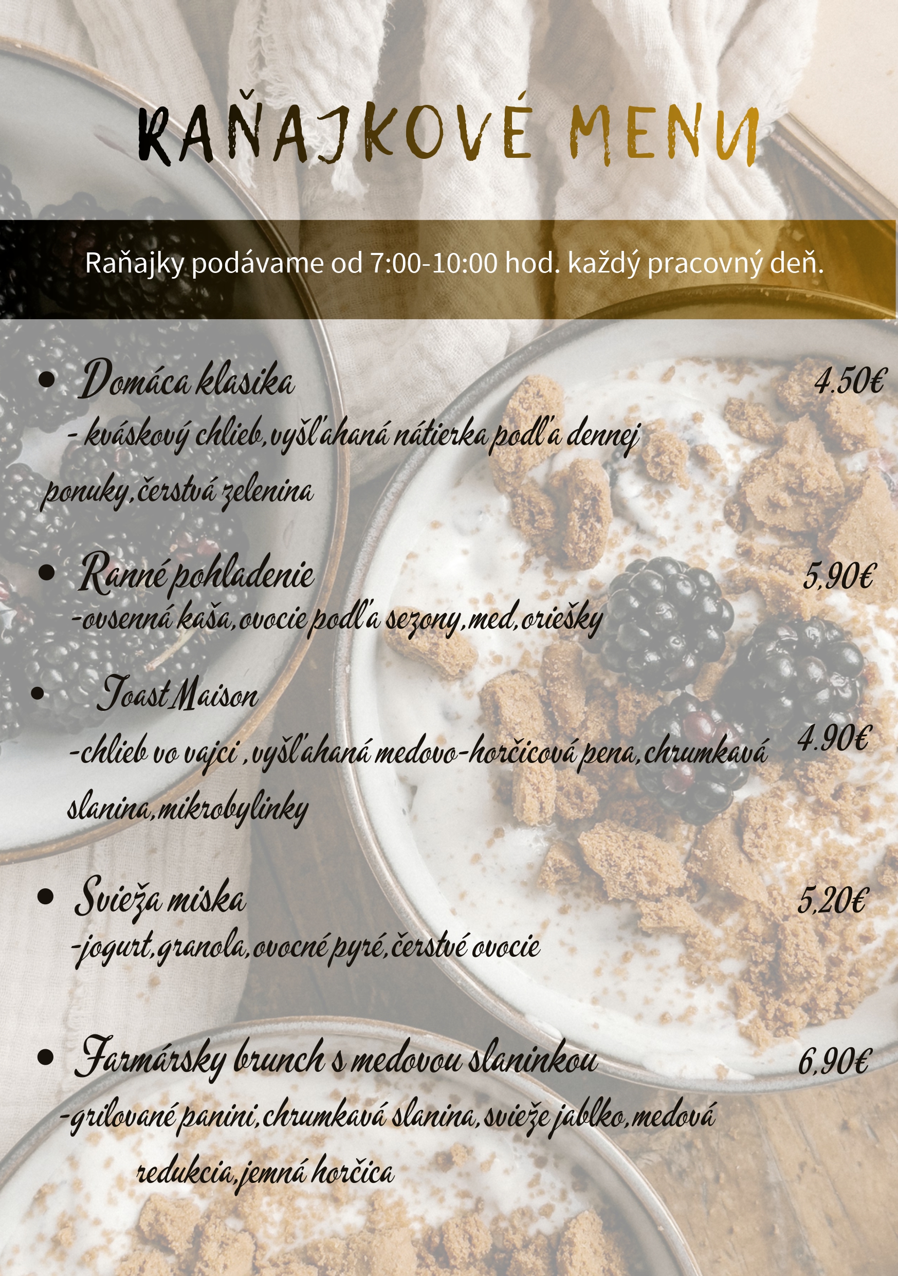 V našej reštaurácii kombinujeme najnovšie trendy modernej kuchyne, inovatívne zariadenia a technológie s tradičnou kuchyňou a štýlom varenia. Tradícia a inovácie idú ruka v ruke – táto idea tiež utvára našu filozofiu varenia a prístupu k zákazníkom. V meniacom sa jedálnom lístku denne podávame jedlá slovenskej aj svetovej kuchyne. Reštaurácia je zameraná na moderné myšlienky a hosťom sa snažíme ponúknuť nielen skvelé jedlá ale aj pocity.